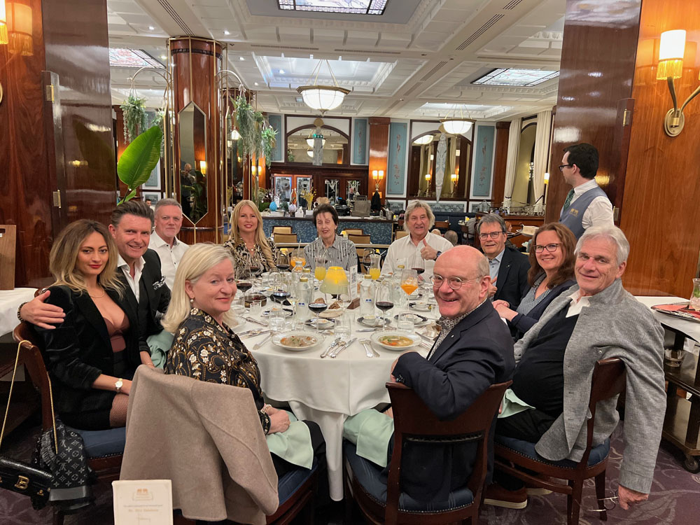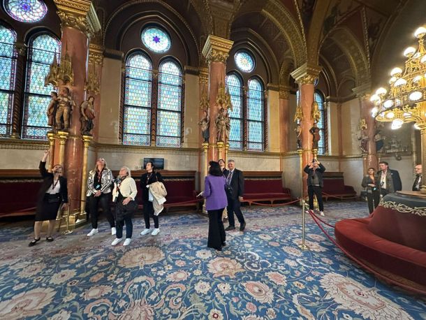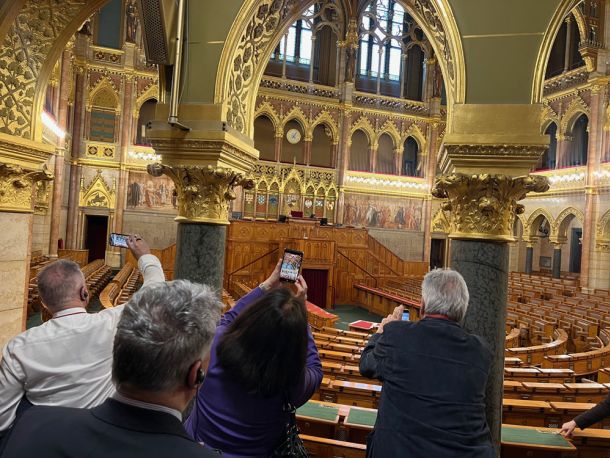 Tag 2: Experience Tour in Budapest: Führung durch das ungarische Parlament: Die eindrückliche Architektur und die gut bewachte HEILIGE KRONE VON UNGARN (Stephanskrone) konnte durch die Schweizer Senatoren bewundert werden. Die Krone ist ein echtes Highlight auf dem Rundgang. Beachtlich auch, dass jeder Parlamentarier seinen eigenen nummerierten Platz für die persönliche Zigarre hatte. Am Abend wurden die Schweizer Senatoren vom Gastronomie-Team vom ältesten Restaurants in Ungarn verwöhnt: Das Restaurant GUNDEL wurde 1894 eröffnet.